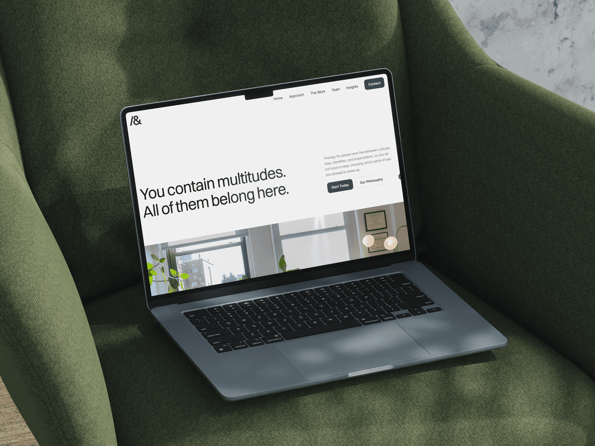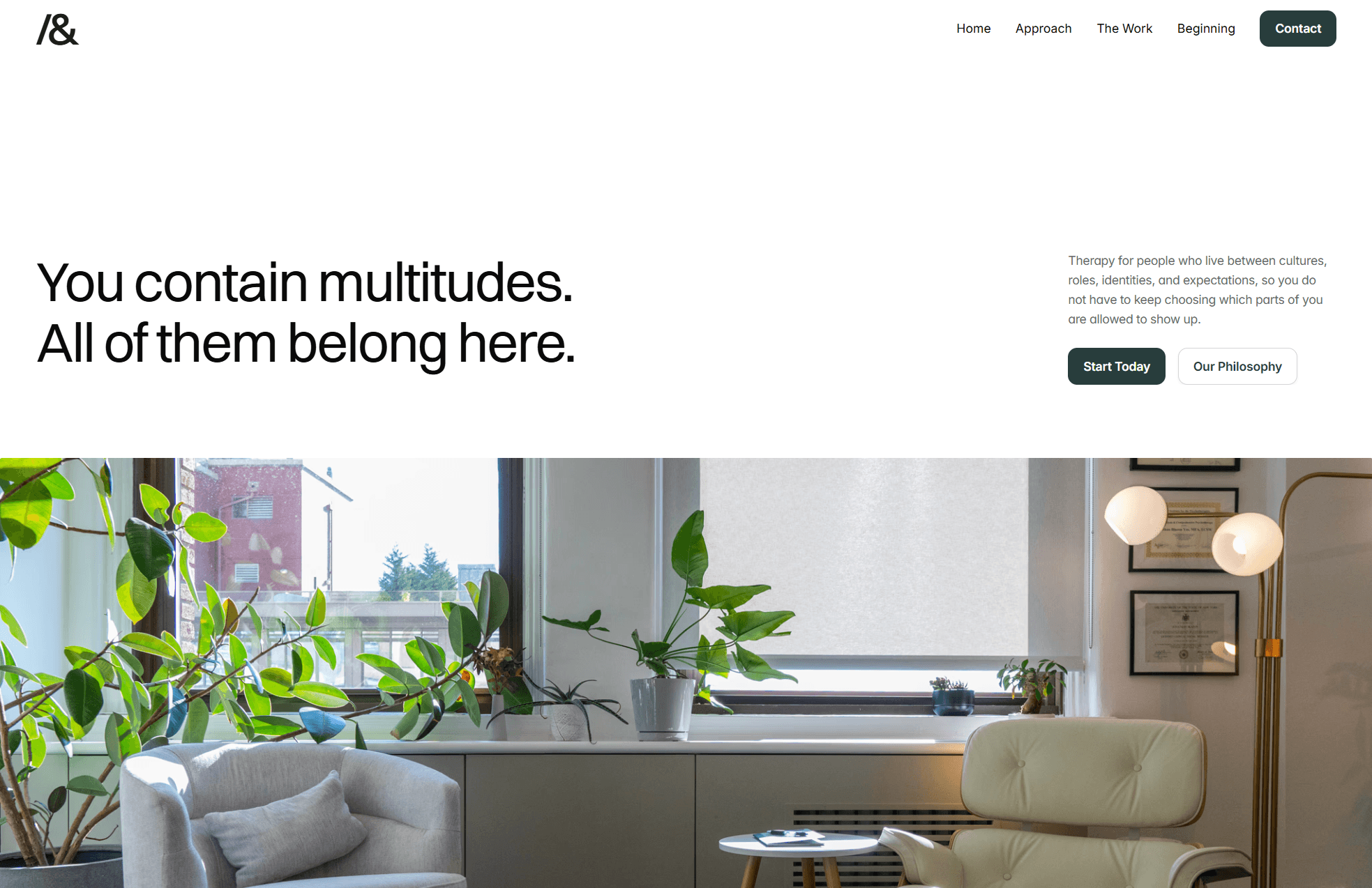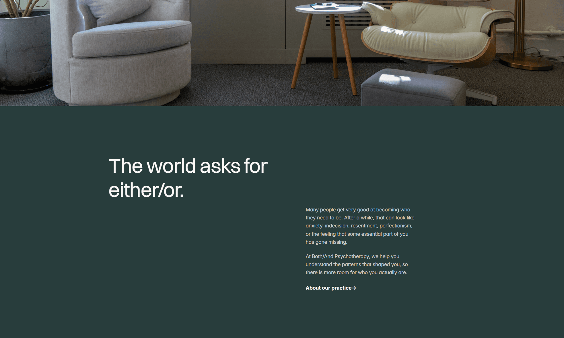 The real project was not designing a therapist website. It was extracting a philosophical framework that had lived entirely inside Jonathan's clinical work and making it legible: multiplicity is not confusion. It is method. The brand "Both & Psychotherapy" became both a name and a thesis.